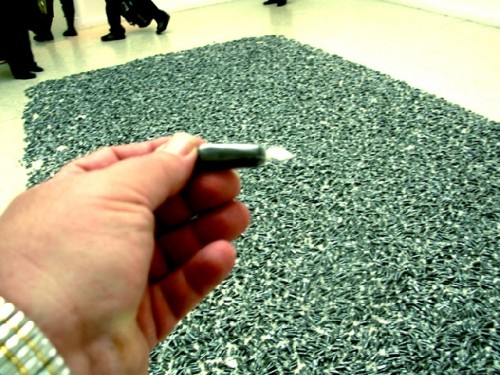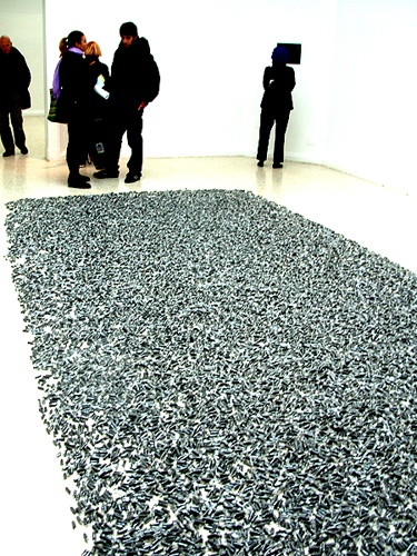 Recently, while attending the Venice Biennale, we viewed and reported on an installation of work by the late artist Felix Gonzales-Torres in the American Pavilion. It was only the second time that a deceased American (in this case Cuban born) artist was so honored. The previous example was an exhibition by the Earth Works sculptor, Robert Smithson. In response to the critical interest and prestige of representing the U.S. at Venice there have been two prominent projects in the past months, one at Harvard University, and a second "Untitled" (Placebo) which remains on view at WCMA through March 23.
