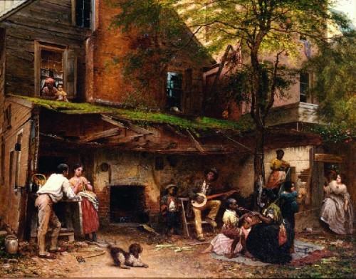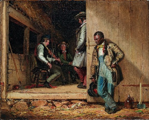 But there is also the serendipity of finding that occasional minor but fascinating painting for reasons more than pure aesthetics. It was a treat to seeChristian Friedrich Mayr's "Kitchen Ball at White Sulphur Springs, Virginia," 1838, from the North Carolina Museum of Art. It is a rare view of household slaves celebrating. We were inspired to draw comparisons to the Eastman Johnson's masterpiece from the New York Historical Society "Negro Life in the South," 1859. In this painting the lady of the house is visiting the slave quarters where she finds lovers courting and a man playing the banjo.