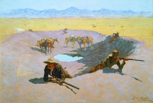 Just for chuckles it would have been interesting to see "Death of Jane McCrea," 1804, by John Vanderlyn. It is a pot boiler about a white woman captured and murdered by Indians. That would have conflated nicely with examples of George Catlin's paintings of Native Americans. Catlin is mentioned in the catalogue but not included in the exhibition. Instead, we view the John Wayne of American art Frederick Remington's "Fight for the Watering Hole," 1903, from Houston. And another image of Manifest Destiny, Charles Schreyvogel's "My Bunkie," 1899, from the Met. I'm curious, does the Met own a Catlin?