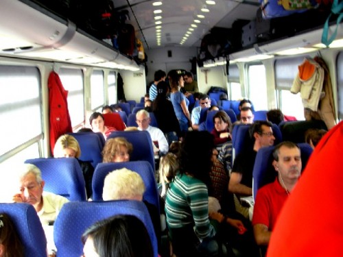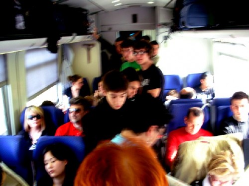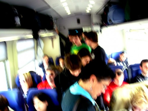Eventually we returned to the platform which was now quite crowded as the train pulled in. It was already packed. Astrid managed to board while I was still on the platform. There was no more room. Frantically I indicated that my wife was on the train and insisted that I squeeze on. It felt like rush hour as we struggled to find room when the doors closed and we departed for a voyage of several hours, standing room only, to Milan.
