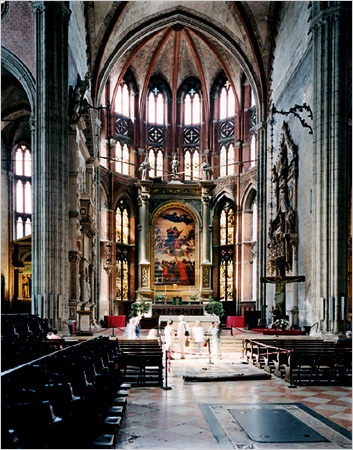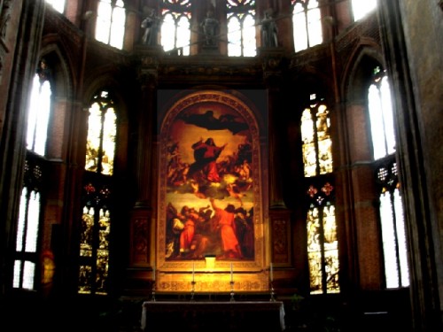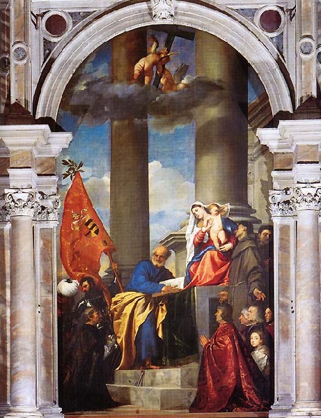 But to see Titian in situ one must visit the Frari in Venice for the great altar pieces. The Fransiscans were not that thrilled with 'The Ascension" when it was installed over the main altar in 1518. But when Charles V offered a handsome price to acquire it they thought better of their complaints that some of the figures of the Apostles appeared to be too large and out of proportion to the smaller, ascending Virgin. Through the science of physics and technique of perspective the artist was seeking a dramatic view but the priests argued that the Virgin should not be seen as smaller is size and prominence than the Apostles. Charles V rightly viewed it as a great masterpiece. Even the British critic, John Ruskin (1819-1900), voiced his reservations that there was too much "fox color" and that it was "not one whit the better for being either large or gaudy in colour." But Ruskin proclaimed the "Pesaro Madonna," which is also located in the Frari, "The Best Titian in Venice."