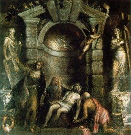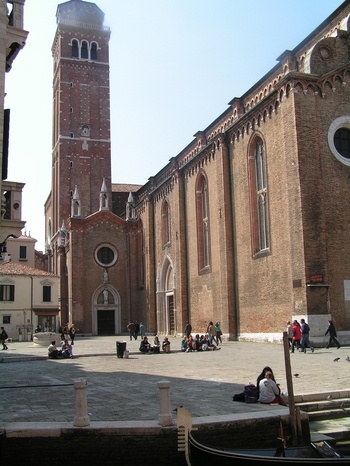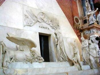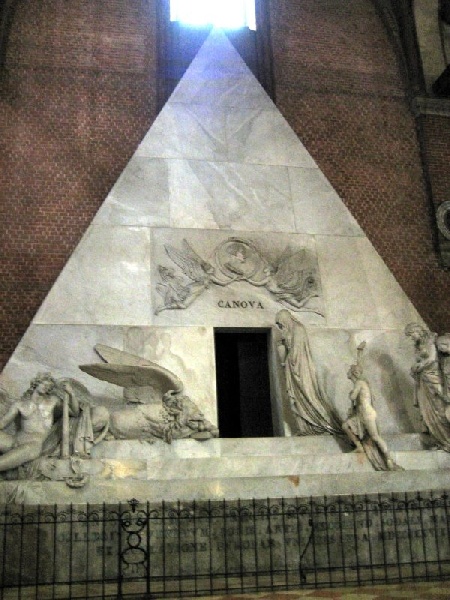 Also located in the Frari is the large, pyramid shaped, mausoleum with figures of weeping mourners entering its interior which was initially designed as a tomb for Titian by Antonio Canova (1757-1822) but never built. When Canova died it was created according to his design by his students for the burial of the master. It is one of the great examples of neo classical sculpture.