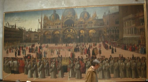 One should plan to spend enough time in the Accademia to fully appreciate its many rooms and the style of the great Venetian masters. The early galleries present the primitives of the Gothic period in elaborate, ornately carved and gilded altar pieces. But the true Venetian School begins with Jacopo Bellini (1400-1470) and his sons Gentile (1429-1507) and Giovanni (1430-1516). I have always found the decorative painting by Carlo Crivelli (1432-1495) with their curious garlands of fruits and flowers oddly fascinating. One sees a lot of Crivelli in the Accademia. Vittore Carpaccio (1455 to 1526) painted large scale, genre scenes of Venetian ceremonies with their elaborate costumes and the exotically attired Turkish ambassadors. The other great Renaissance masters include Giorgione, Titian, Tintoretto (1518-1594) andVeronese (1487-1553). The masters of a later generation include the ceiling painter Tiepolo (1696- 1770) and the great Vedute or landscape painters Canaletto (1697-1768) and Guardi (1712-1793) as well as the genre paintings of Longhi (1707-1785). There are works by all of these masters on view in the Accademia.