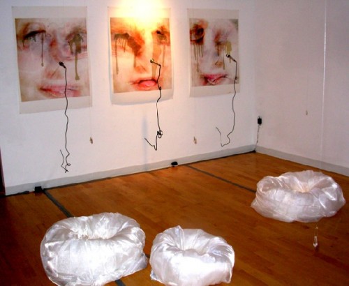 So it was a relief for both of us that the work that we recently discussed is back on track and past the speed bump. Primarily I think of Brown as a painter but there is also an experimental, multi media aspect to her practice. In particular she has been exploring, like everyone else, the possibilities of Photoshop. This has resulted in large format prints that play between self portraits and premonitions of death with layered elements of skulls and flayed flesh. But one has to dig deep to find that as it is not intended to pop out. There is distance, introspection and ennui in the imagery which also entails suspended microphones that convey dead silence as a metaphor. On the floor are illuminated tubes with translucent white cloth shrouding. We peer down into the centers of these glowing pools and find those haunting, drowning faces. Overall this is a somber, melancholy but resonating effort but is far more abstracted and aesthetic than literal so perhaps I am reading too much into my interpretation. Surely the artist will differ from this opinion. Which seems like a good beginning for a beer and burger.