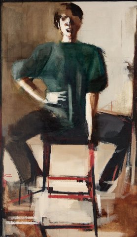 The self portraits, never having been previously exhibited at Gallery NAGA, give context to Schwartz’s later studio paintings. Self Portrait (1986) is the earliest painting in the exhibition. In it, Schwartz’s torso is half turned but her gaze reaches across her shoulder to encounter the viewer. In fact, all of Schwartz’s self portraits depict the figure gazing directly at the viewer. Self Portrait in Pink Shirt (1988) portrays a confident artist seated on a stool, arms strong and propped in front of her, as if to challenge the viewer or perhaps herself.