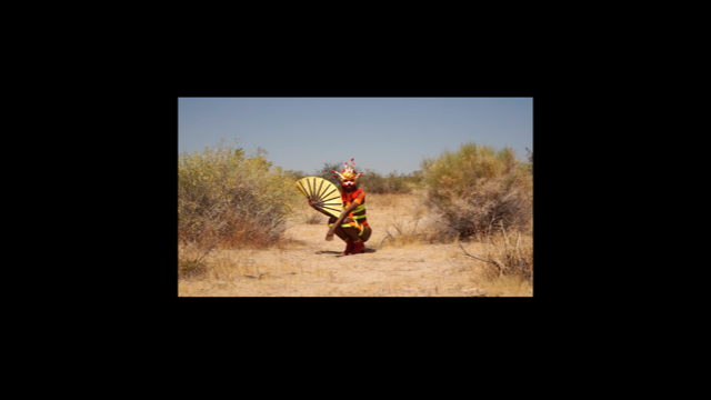 Jojo Abot, also in “Identity,” has three striking images for character in The Divine I Am. A white face with black lines forming strong details, a real and sweet human face (very brief), and a dancing figure of indeterminate sex, covered with bands of brightly colored ribbon, dancing to words and tones. Abot uses a double screen, to give us the contrast between fire and sand, cross and circle. We move close up and then to distance, which are compared.