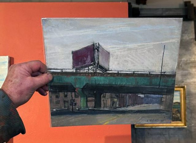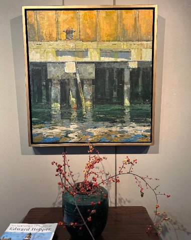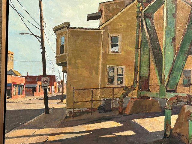 Not only are his paintings often less than pretty as a picture, some might qualify as grotesque. I was riveted by a large, generic dwelling, rendered in shadow hovering under what proves to be the Tobin Bridge in Chelsea. While a monstrosity I could readily imagine living with it. He has also painted the industrial waterfront of East Boston.
