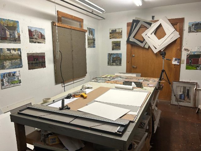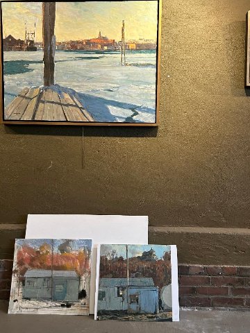 Standing in the downtown Gloucester space he stated that there is an inventory of some 60 or so paintings. The smaller ones are created en plein air and the larger ones worked up in the studio from sketches and studies, two of which were leaning against the studio wall. His primary concern is getting the composition right. One result of the CAM show is that, to his surprise, the sketches are beginning to sell.