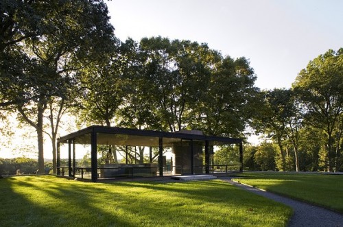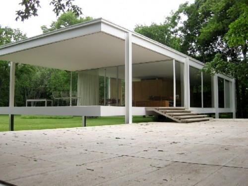In 1946, he was commissioned to design a house in Plano, Illinois, the Farnsworth House, a week-end retreat outside Chicago for Dr. Edith Farnsworth. This project, completed in 1951, takes the lessons of the Barcelona Pavilion and explored the relationship between nature, shelter and people. Once again, exposed industrial steel and plate glass were used to create striking and even emotional architecture. The mostly glass pavilion is raised six feet above a floodplain and literally floats above the prairie.