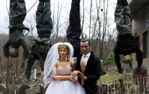The wedding is staged in front of a gallows of SS attackers hanging by their heels. They had beaten his alter ego before being captured by several knife and gun wielding Barbies. Their execution is justice rendered for Hogancamp's real life and fantasy assaults.