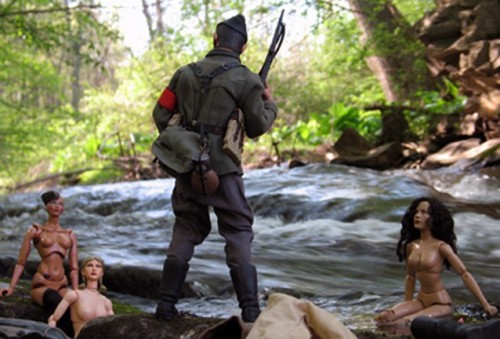 Remarkably, the dolls, which he alters and dresses to make them compellingly authentic, are used to create story lines that act out his real life relationships and trauma. Some of the conflict, depicted with gruesome detail, is gory and graphic. It allows him to confront and act out rage and a desire of revenge on his savage attackers. The real life thugs have morphed in his fantasy village as the SS. These he distinguishes from enlisted German soldiers who, in his narrative, drink at the same bar with American and French troops. They all enjoy staged “cat fights” between his sexy Barbies.
