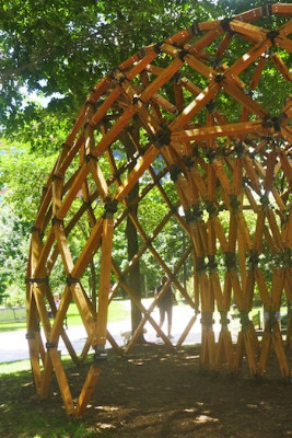 Then there is Cristina Parreño Architecture’s 17 ft tall thin rectilinear tower: Tectonics of Transparency: The Tower. Constructed of 350 custom fabricated glass blocks, the designers see it as an “urban periscope.” The physically slickest composition in the installation, it is also the least imaginative of the group. This sculpture seems to pose a self-consciously conceptual approach to design. With The Tower, material follows form. Its monomaniacal structure says ‘tall and narrow.’ In contrast, GLD’s Grove stresses all aspects of craft, both architectural and digital.