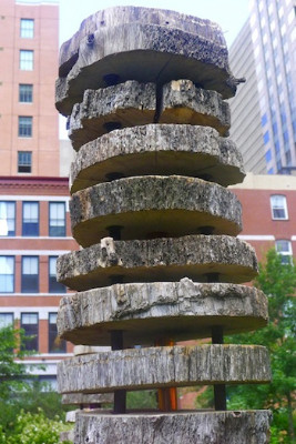 Marginal is created from eight recycled pilings taken from a Boston shipyard. Each was sliced into 2” thick cross sections. These pieces were reconfigured into 18 columns set in a grid. Wonderfully, they spatially reference history as well as nature — past, present and future.
