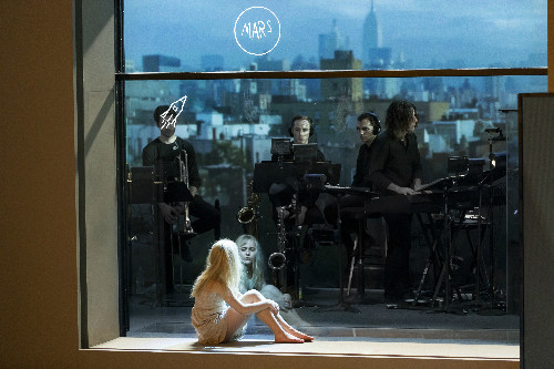 Also, appearing, disappearing, and appearing again and again, is the ethereal, and beautifully voiced, Sophia Anne Caruso who in the program is billed as Girl. Appearing to know all about Newton, her mission is to help him return to outer-space world. It is a double-bind, as Newton’s mission is to help free the Girl (who just might be an apparition) from her limbo state. Bowie’s lyrics in Life on Mars “now she walks through her sunken dream to the sear with the clearest view and she’s hooked to the silver screen,” fit like a glove to her character.