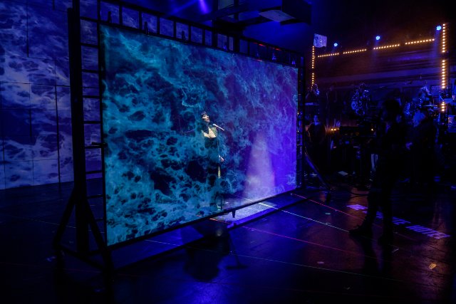 Video projections designed by Josh Higgason and Maxx Berkowitz are sometimes recessive and at others bold. They open up the already large space with crashing waves which are bigger than the scenes unfolding before us.