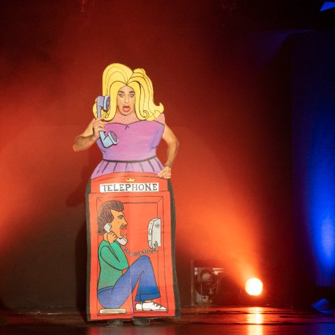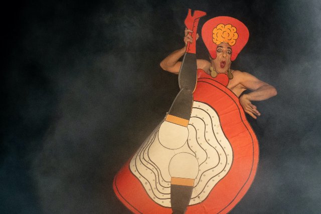 Each vignette requires a different outfit, resulting in frantic changes. An occasional “wardrobe malfunction” occurs, but nothing of consequence, certainly not as titillating as Janet Jackson’s at the Super Bowl – although this performer does get a little naughty from time-to-time. Some costume changes are done in the dark. Many are on the fly, with Ennio wearing multilayered, tearaway constructions. At times, the revelations seem like pulling rabbits from a hat. Perhaps the most clever onstage transformation is when Queen Elizabeth II morphs into a different Queen – a toothy Freddy Mercury.