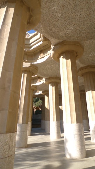 The grand stairway leads to what Gaudi considered a forest of Doric columns. This grouping is one of the few truly classical architectural element arrangement that Gaudi ever did. This was based upon the Temple to Apollo at Delphi in Ancient Greece. The forest of eighty-six columns was to be the market area for the residents of Guell's visionary development project. Located at the second level of the park, Gaudi slanted the outer ring of columns. This was a technique done by Greek architects. Gaudi exaggerated this slant to strengthen the structure and to give it more visual vitality.