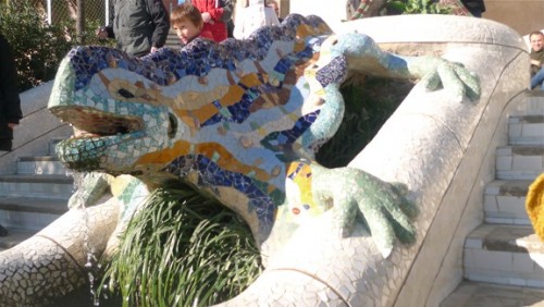 At the third fountain is the famous Park Guell Dragon. This dragon has become an icon of Park Guell. Visitors want there picture taken with it. To Gaudi, the dragon had many important meanings, and the use of it and its various body parts can be seen throughout the master architect's work. Built of prefabricated hollow brick that was covered in vibrant colorful ceramic pieces, the Park Guell Dragon is a surprising and instantly loved fantasy creature.