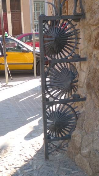 Decorative metalwork adorns the gates. This use of metal, often abstracted, informed much of Gaudi's work and acted as a material counterpoint to the use of ceramic mosaics, the use of stone, and the often raw and naturalistic use of concrete aggregate.