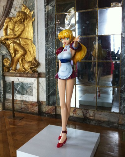 The closest we get to the subject of sex at Versailles is the six foot tall Miss Ko² (1997), a young, short-skirted, stiletto-heeled, perky breasted Barbie doll blond. Awkwardly placed in a corner of the Salon De La Guerre, Miss Ko² is dressed as a waitress, the type that the young female Hooter-like servers wear at Anna Miller’s, a popular chain of restaurants in Tokyo.