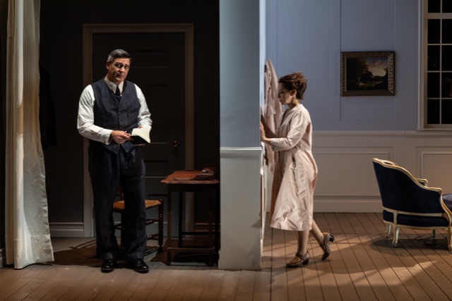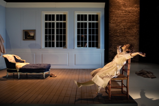 Director Emma Griffin reports adding two figures to the tone poem, a male and female dancer. While dopplegangers have been everywhere apparent in the 2020 Protoype Festival of which this is a part, here they serve another purpose. When Ellen describes being repulsed by a couple who are obviously having sex and then eating dinner, we see them having dinner on stage. They often act out scenes that are described.