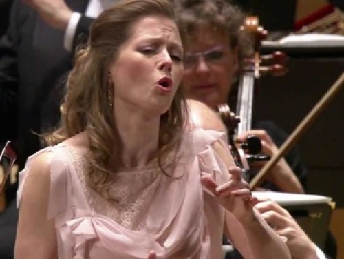 Hannigan wears her Ophelia dress, which she also wore when Andris Nelsons conducted let me tell you with the Berlin Philharmonic. It is a muted mauve, dripping over one shoulder like leaves of a tree and over the other as rent cloth. Draped in gathered tiers to the waist, it slithers to the ground, housing an exceptionally beautiful voice as it moves with the artist and her crafting hands.