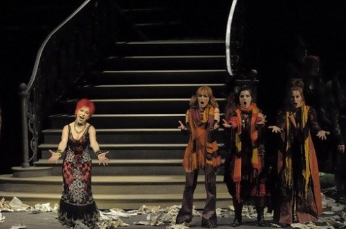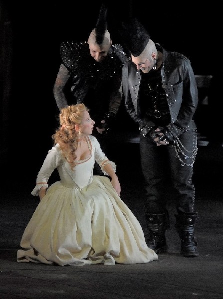 Coline Serreau is responsible for the mise en scene. Costumes, lighting and particularly the kooky automotive props were surprising and delightful eye candy. From the Lescaut and company punks with spiked hair and tomahawks to the corps de ballet, dressed in orange, greens, yellows, pinks and reds as they danced on roller skates, the production delights. In contrast with a dark, bleak period settings, the visuals are campy and cool. Girls came on a runway dressed for a spring fashion show in tight short gowns and then hooped extravaganzas. Backgrounds were conservative. Chic costumes and hip lighting rocked. Lights were even blacked out around performers before the scene ended, enveloping the entire house in dramatic darkness.