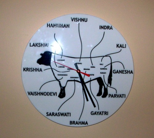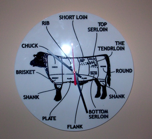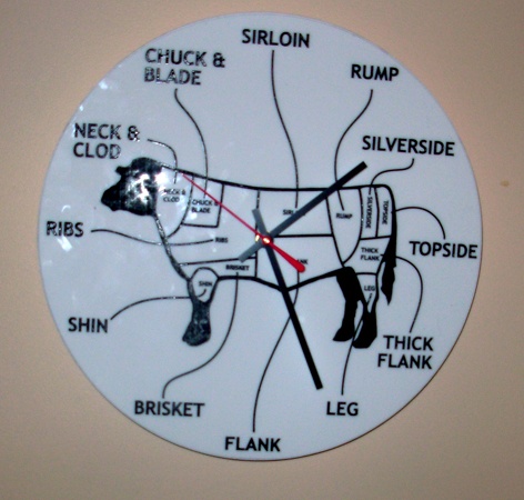 Another very saleable series consists of the three "Meat Clocks." The faces of the clocks consist of diagrams of a steer with the varying cuts of meat. One clock conveys American terms and cuts, the second, British, and the third, Indian. Of course the humor comes from the fact that the Indian Beef conveys no "cuts" as India's Hindus are vegetarians who consider cows as sacred incarnations of their ancestors. Another very successful small work is the "Light Garden" in which, with miniature rakes, one manipulates glittery objects on a light table that causes interesting modifications.
