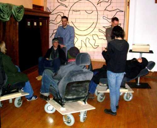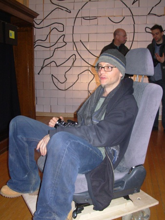 Much of the work in the interactive exhibition by Holoubek, an alumnus of New York University's Tisch School of Drama, and now an adjunct professor in NYU's Interactive Telecommunications Program (ITP), was assembled on site. This includes four car seats bolted to wooden platforms mounted on rubber wheels. During the lively opening guests sat in the chairs, moved them around in varying configurations, and even used the levers to kick back into reclining positions.