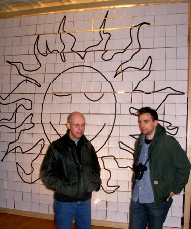 Similarly, the large, generic sun with a smiling face at the end of the gallery space is destined for a brief existence extending through the run of the show. It is another of those ideas that Holoubek has long hoped to execute. The 12 x 12' "Sun Mural" is assembled from numerous, individual sheets of paper forming an enormous blowup of the very first image that the artist downloaded from the internet.