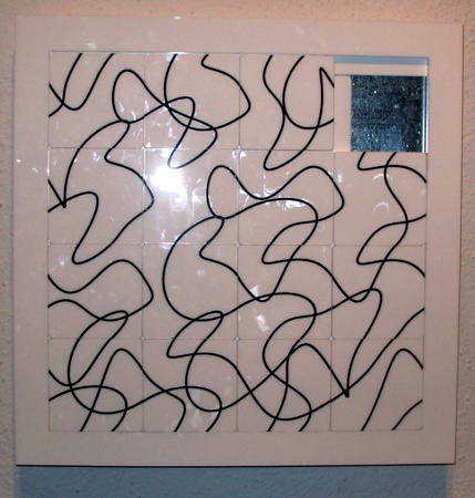 While the work is being displayed in a "gallery" there doesn't seem to be much of a marketing strategy. There was no price set on "Car Seats" and "Sun Mural" but several other works in the exhibition seemed quite collectable. There are four pieces in the series "Everybody Wins (Hoora! Hoora! Hoora!)" which are small, exquisitely crafted, modular grids made of different materials, wood, metal and plastic. They are designed in such a manner that one may interact with them by moving square elements into different configurations. Astrid described it quite succinctly as resembling one face of a Rubik's Cube puzzle.