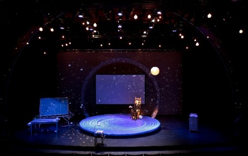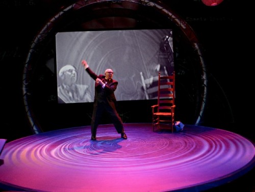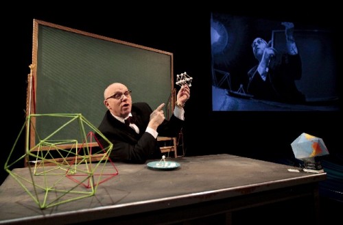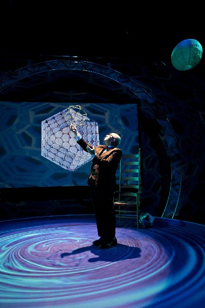 This production through Thomas Derrah's stunning performance examines Fuller's vision by looking at time, place, history and the universe as a whole. This is underscored by a constant series of interconnected conceptual riffs, personal and often poignant revelatory stories, geometrical and technical discourses and demonstrations illustrated by songs, movement and dance underscored by archival projections, photos, drawings and sketches.