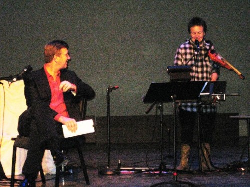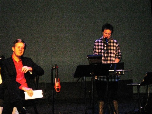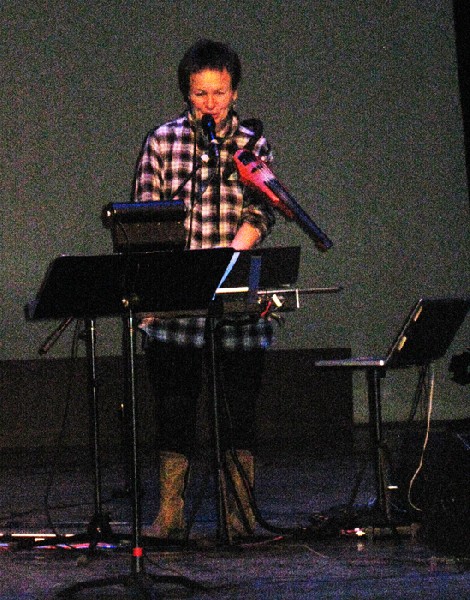With her trade mark, spiky hair she was attired in pants, boots and a flannel shirt. The general mood was casual and low key as she exuded friendly charm and a sprightly sense of humor. Mostly she down played the occasion and informed us that she has no great talent for playing the violin and takes a home made approach to the instruments and technology she uses. There was little or no art speak as she conveyed a hands on, intuitive approach to creativity.