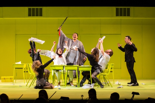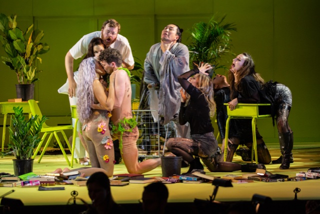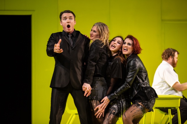 We are immediately struck by the lime color of the set: the walls, lights, desks in a school room where God’s lessons are being taught, or unlearned. Clever James Darrah captures both the weight of Rev. 23 and its surprising hopefulness in his production. Responding to an exuberant score by Julian Wachner, the Furies dance together across the classroom, lofting comments, instructions and denigrating the ideas of Lucifer. This is his world and Alexander Birch Elliott makes a virile, big-voiced demon. Kyle Van Schoonhoven is a rattled Hades with a commanding voice.