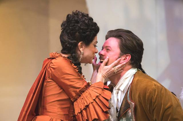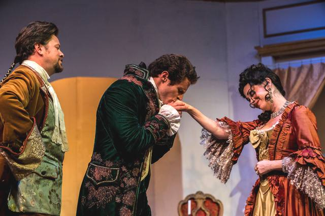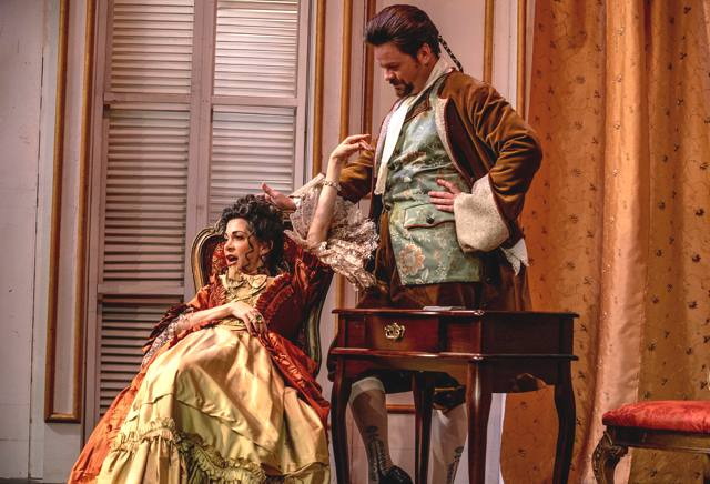 “Les Liaisons Dangereuses” at San Diego Rep Theatre’s Lyceum Space stage, is the third production from the young New Fortune Theatre Company co-founded by Richard Baird and Amanda Schaar. It’s a gorgeously costumed, engaging, romp in sexual intrigues that caused scandals when performed in 18th and 19th century France and raised eyebrows in randy Restoration England as well.