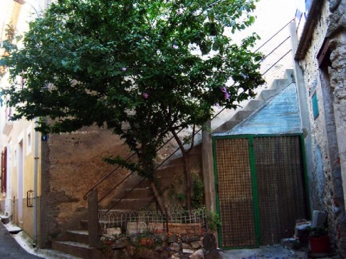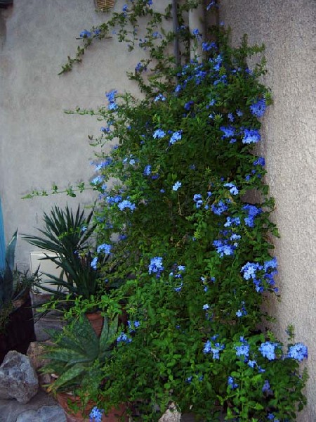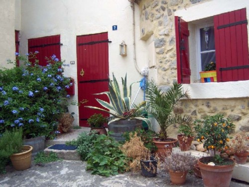 Their home in Paraza was gutted before they moved in, as many old houses in the village have been updated. The contractor built open spaces, on three floors, in a Mediterranean style, with a large roof deck and a magnificent one hundred mile long view. Therefore, many people in Paraza spend much of the time at home on their decks. As the village houses are built wall to wall along small and smaller streets, the first impression for an outsider is not inviting. Why would foreigners want to move here? The smallest trees and plants are craving soil. Later, of course, we discovered houses with gated court yards and luscious gardens, as we walked down fifty steps to the Canal du Midi. In front of many houses one can find small and large potted plants that grow so well in the sunny climate. Long lasting and heavenly colorful flowers bloom all summer and into the fall. The plants embellish the brown and grayish facades.