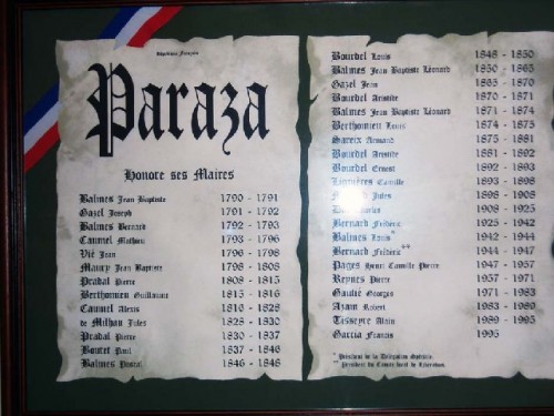 At the Town Hall we noted on a plaque the succession of mayors, 34 in all, since 1790 to date. M. Francis Garcia, the current mayor, has been in office since 1995. Paraza has just under 600 inhabitants, and it is noted that in 1830 the population was around 400. But, as already reported, the earliest documented mention of 'Parazano' goes back to the 12th Century.