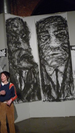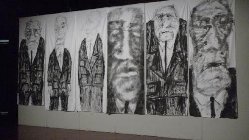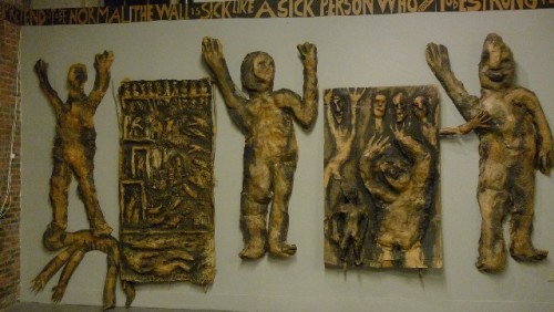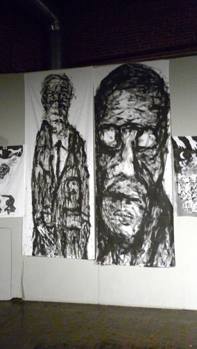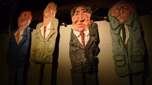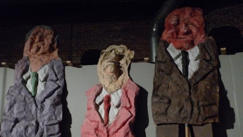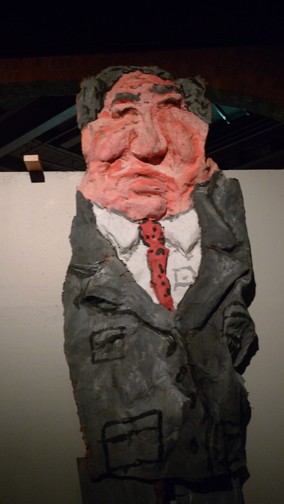 The exhibition's pieces range from expressionistically drawn black and white establishment or authority figures and massive heads to painted sculptural figures and elements. The drawings are strongly rendered while the papier mache sculptures are set as narrative friezes. The sculpture is placed in a separate area. There are written phrases placed above the vignette pieces. The controversial theme of these pieces is on the recent Gaza conflict. War is a hard thing to visually portray.