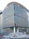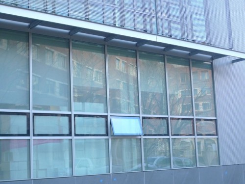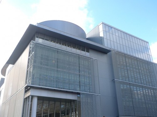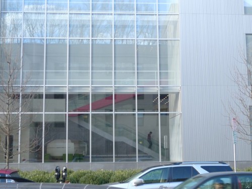 Maki makes elegant use of glass, stainless steel, and steel screens on the exterior of the building. The exterior is a silvery grey. His use of geometric forms is masterful. The roofline of the building is interesting and visually appealing unlike many other campus buildings that reveal utilities, generators, and airflow mechanical apparatus.