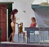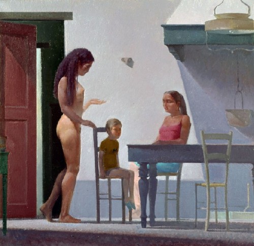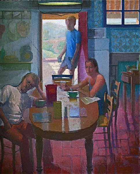 Recently, the theme of studio life vs. home life has been emblematically restated in the hybrid still life Household (2007), where the studio in the foreground is set against the home, seen through the window. Closely following A Studio View (1988–90) in time is the Visitor (1992–93), in which the artist's wife, then a young mother, sits at a table in their Italian summer home with her little boy. As we look from mother to son, we become aware that the tall nude woman with classical Greek braids standing behind the boy is an apparition that only we can see.