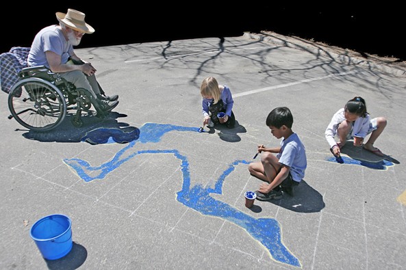 That ambitious project never got launched. But to give the city and potential sponsors a taste of what it would entail, in August of 2010, Sidewalk was on hand during the creation of a large and colorful design on Holden Street.
