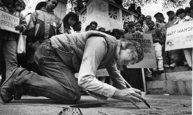 Throughout the 1980s and 1990s, he organized chalk-drawing festivals, open-air art exhibits, and public art events that engaged participants in the creation of large mosaics, murals, and banners. In 1990 and 1991, Sidewalk organized the Boston Artists’ Summer Festival.