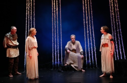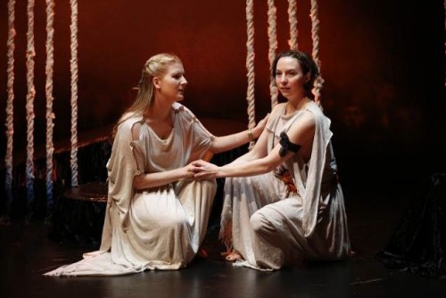 Ismene, the sister, who would share culpability is played with surprisingly stiff conviction by Katie Brogan, who at first is shocked by Antigone’s willingness to defy the King and then insists on joining her in the punishment, buried alive in a cave so that the sympathy of the citizens of Thebes cannot reach her.