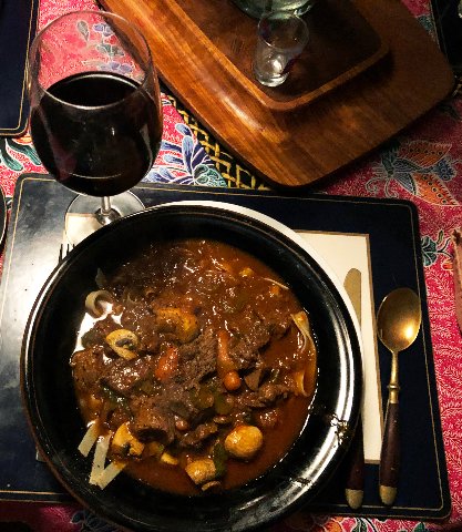 Being a weekend night I treated myself to a nice red wine. The Goulash was so delicious that we both ate more than enough. In that sense it seems that my Hungarian Goulash was quite authentic. Astrid, a tough food critic, gave it two thumbs up.