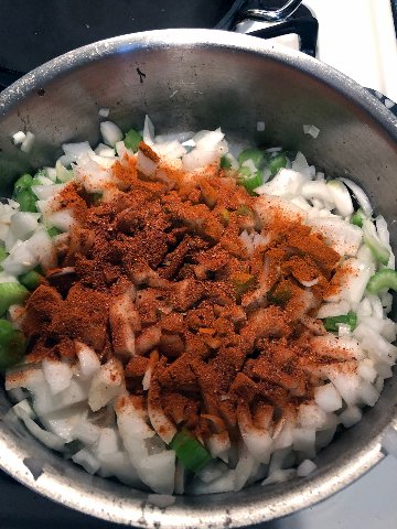 In three batches I browned the meat in a skillet. The same pan is used for a large amount of onion. I diced two large Vidalia onions which lent a nice sweetness. To this I added three chopped sticks of celery. After this reduced and started to soften I added two generous teaspoons of Hungarian and one of Smoked Paprika as well as caraway seeds. Then a few good shakes of baharat. I should have added a couple of bay leaves but forgot.