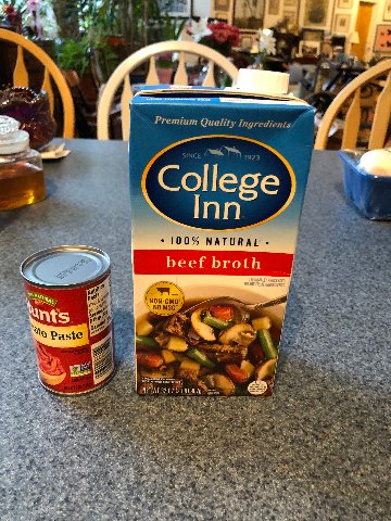 This was all put into a medium sized pot. A crock pot is an option. To this was added beef broth sufficient to cover the mixture. A can of tomato paste was folded in. Fresh or diced canned tomato is an option. Some chefs do not go with tomato. A Hungarian artist friend uses turmeric and cumin instead of paprika.