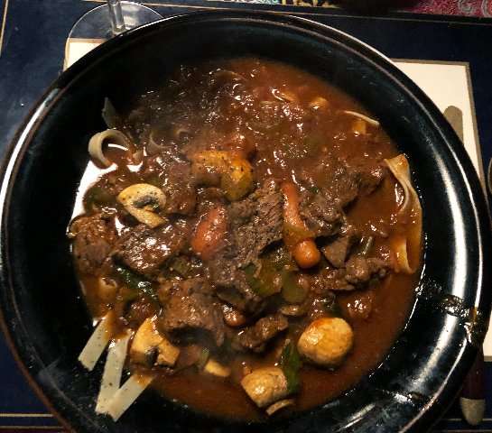 For the very first time I took on Hungarian Goulash. It’s a standard menu item at the Austrian, Haflinger House in Adams. Their version comes in a metal pot with meat and dumplings in a thick sauce.