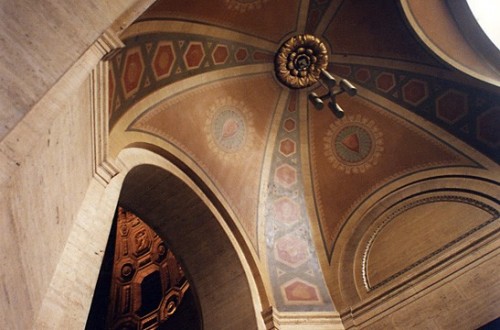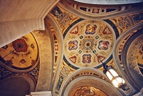 In contrast to the ceremonial Great Hall with its elaborately decorated groined and conical vaults, the exterior is a simple faux Renaissance facade topped with a relatively undistinguished high-rise.