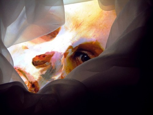 It was a relief to settle down and actually experience the work and engage in a dialogue about it. This was precisely the kind of one to one interchange that is all too rare with colleagues whom we see day in and day out for decades. "The women come and go talking of Michelangelo," Eliot. A life time can pass in which we measure out our lives in tea spoons sweetening the bitter taste of daily life as well as the occasional ground swells of the horrific and tragic. Apparently, Brown had been through a heavy slog of that, and as a part of the Buddhist process, had opted to look death in the face by making a series of self portraits layered over with skeletal elements. These Photoshop derived images were then embedded into an installation by forming light box pools or wells, circles surround with translucent white gauze, that we look down into. These act as signifiers of the ersatz wishing wells of life, transition, loss and memory. How to be a part of and embrace life to the full and yet be capable of tossing off the dearest thing we own as if it were the merest trifle.