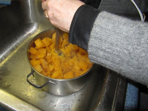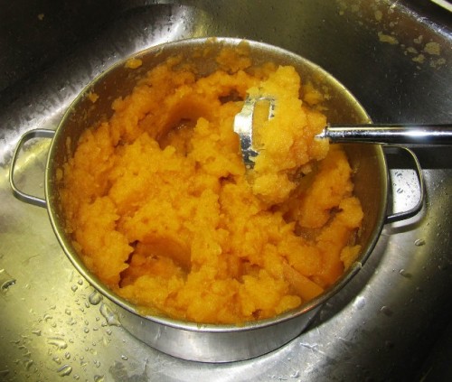 Putting the pot in the sink because of spatter she had just the right tool for mashing.